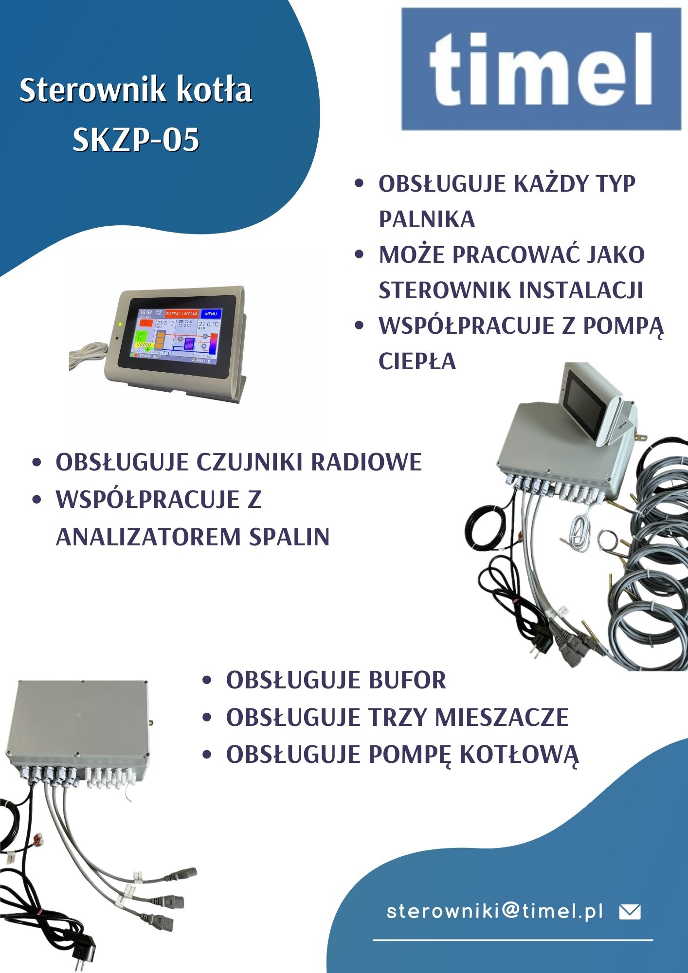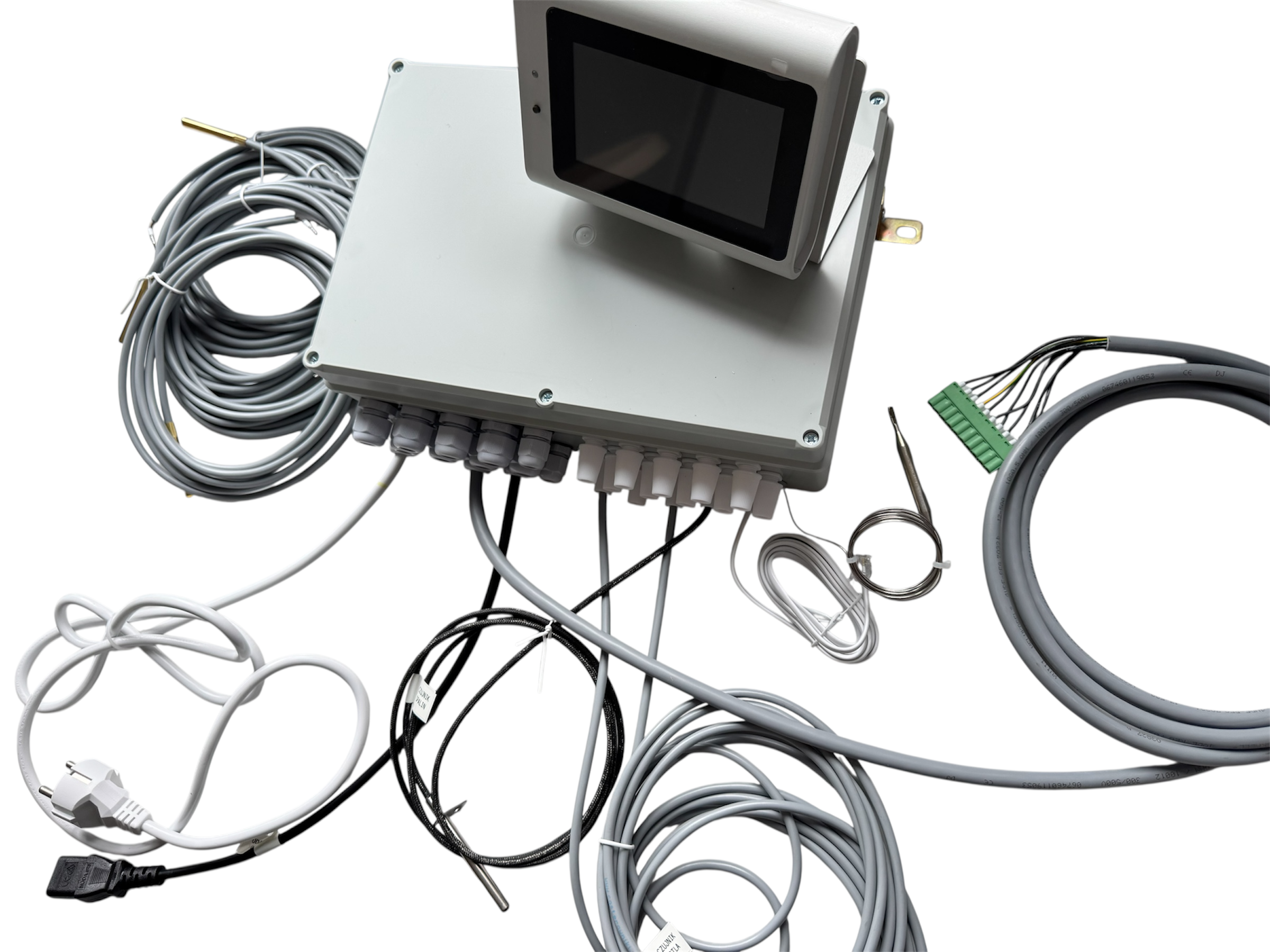 W zestawie: - Sterownik SKZP-05 z panelem sterującym - Przewód zasilający - Zapasowy bezpiecznik - Czujnik temperatury kotła (3 m) - Czujnik temperatury podajnika (3 m) - Czujnik temperatury CWU (ciepłej wody użytkowej) (3 m) - Czujnik mieszacza (3 m) - 3 szt - Czujnik powrotu (3 m) - Czujnik spalin (1,5 metra) - Bezpiecznik temperaturowy STB (1,5 m) - Blacha do mocowania wyświetlacza - Instrukcja obsługi - Przewód do palnika pelletowego (10 żył) - wyprowadzone wszystkie sygnały dla palnika. Można dodatkowo dokupić płytkę zbiorczą palnika aby ułatwić podłaczenie. Wgrane oprogramowanie V6.00 dedykowane do palnika wrzutkowego.