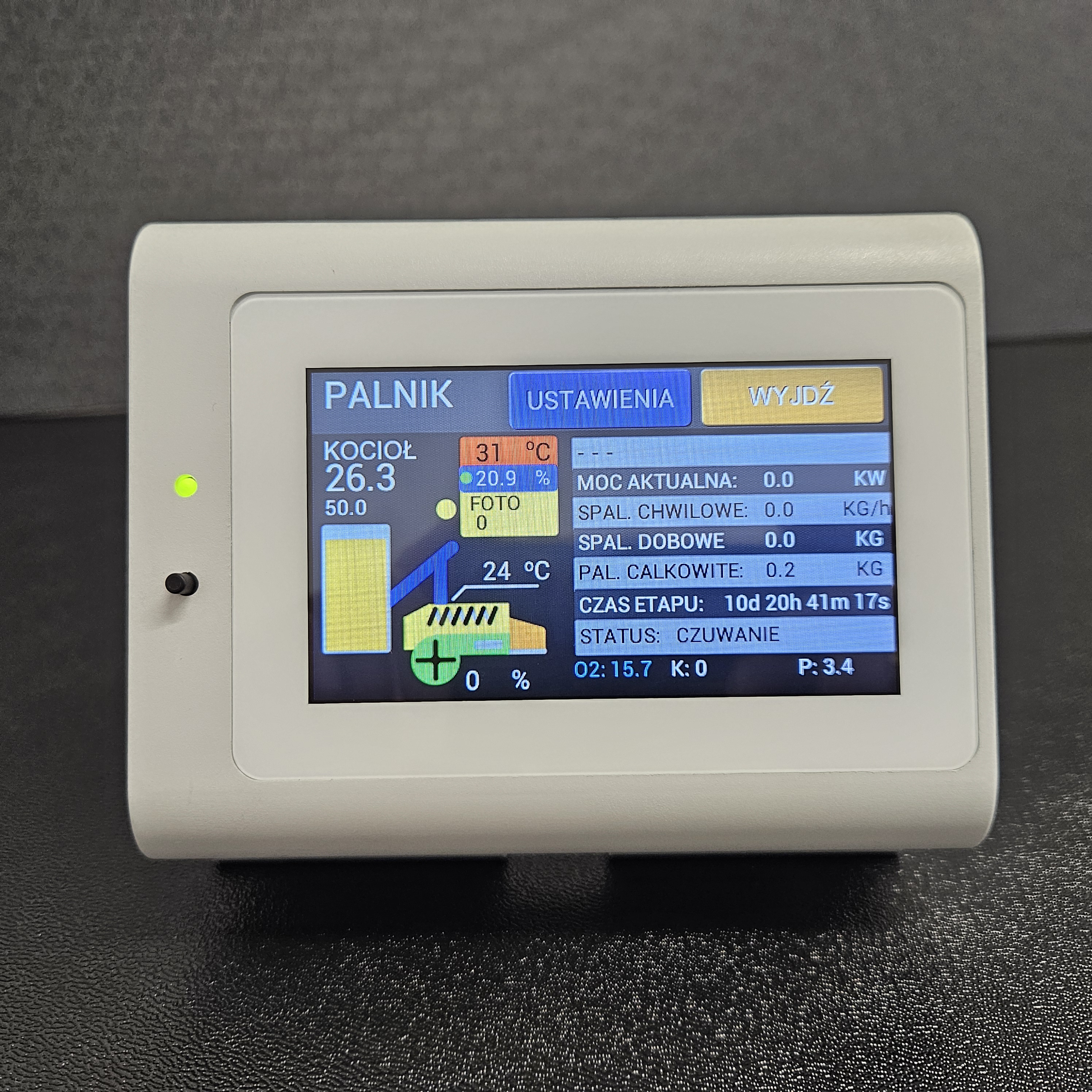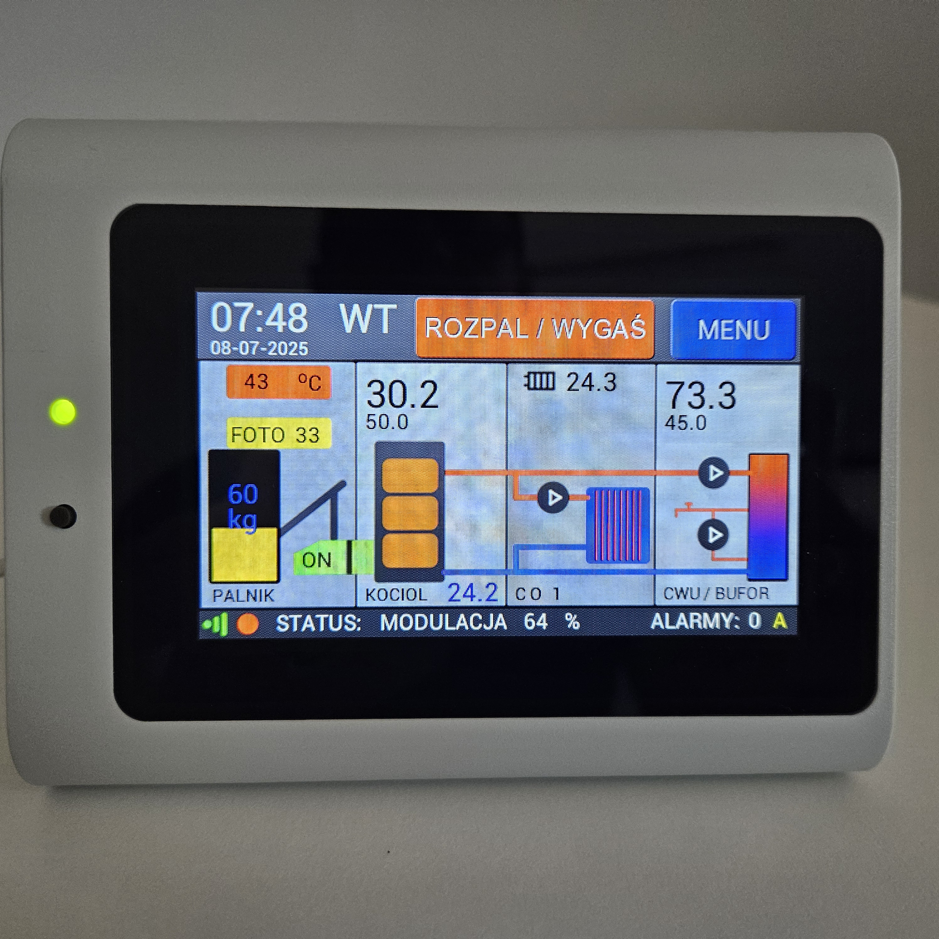 • Duży (4,3 cala), kolorowy wyświetlacz pojemnościowy LCD sterowany dotykowo • Intuicyjny w obsłudze • Steruje kotłami na paliwa stałe - pellet - palniki wrzutkowe np. Ekomat, Skiepko, Viper, Venma, Kipi, itp. • Steruje trzema pompami CO, pompą CWU, pompą cyrkulacyjną CWU (możliwość pracy CWU w priorytecie) • Steruje pompą ładowania bufora • Steruje pompą kotłową (sprzęgła) • Steruje trzema zaworami mieszającymi (3 lub 4 drogowym) • Steruje płynnie pracą palnika • Steruje zapalarką palnika • Steruje odpopieaniem palnika • Wbudowany regulator temperatury pokojowej dla każdego obwodu (opcja - czujnik dokupujemy osobno) • Wbudowany regulator pogodowy (opcja - czujnik dokupujemy osobno) • Możliwość pracy z dowolnym uniwersalnym regulatorem pokojowym dla każdego z obwodów CO • Wbudowany programator czasowy (tygodniowy) dla obwodów CO , CWU oraz kotła • Automatycznie dobiera ilość paliwa i nadmuch do zapotrzebowania instalacji • Wbudowany licznik zużycia paliwa • Pomiar temperatury spalin • Ochrona podajnika przed przegrzaniem • Pomiar i ochrona temperatury powrotu kotła • Wbudowane zabezpieczenie temperaturowe kotła (STB)